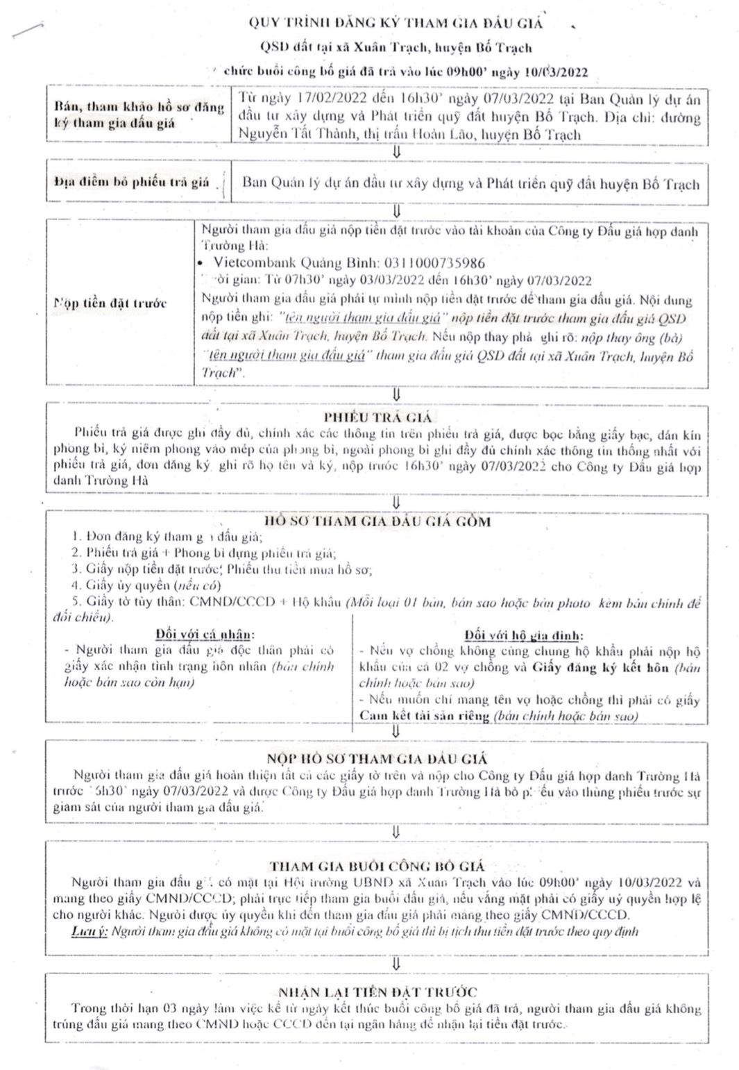 Mọi thông tin cụ thể được niêm yết tại trụ sở: Công ty Đấu giá hợp danh Trường Hà, Ban quản lý dự án Đầu tư xây dựng và Phát triển quỹ đất huyện Bố Trạch và UBND xã Xuân Trạch.