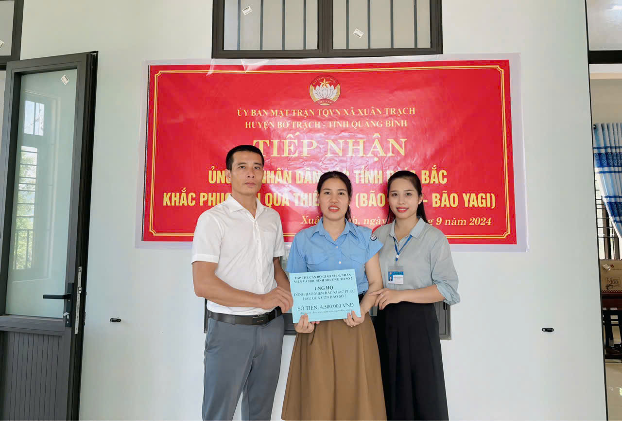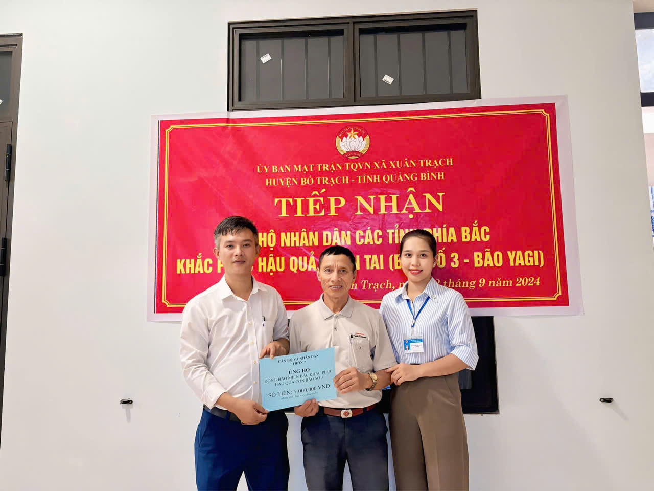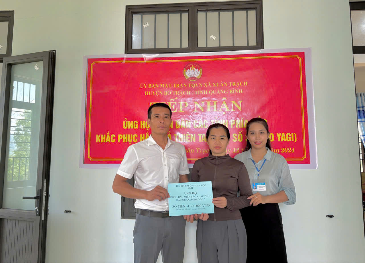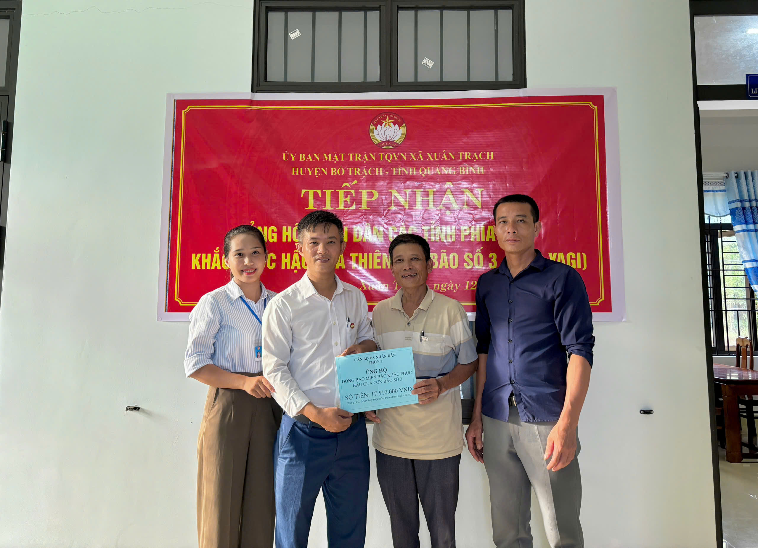 Thường trực Uỷ ban Mặt trận Tổ quốc Việt Nam xã Xuân Trạch đã chuyển số tiền tiếp nhận về Ban cứu trợ của Ủy ban Mặt trận Tổ quốc Việt Nam huyện Bố Trạch, tỉnh Quảng Bình để kịp thời chuyển đến đồng bào các tỉnh phía Bắc. Góp phần cùng đồng bào nhanh chóng khắc phục thiệt hại, để vượt qua những khó khăn, mất mát ổn định đời sống, khôi phục sản xuất./.